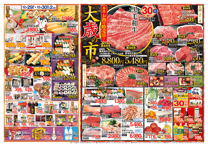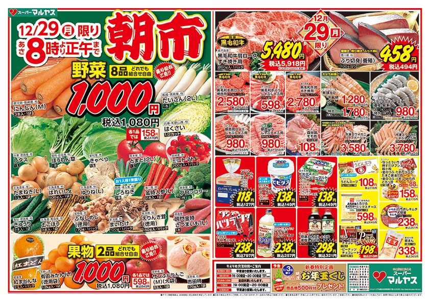 29日は朝市開催!!お野菜・果物を大放出!!30日は大歳の市!マルヤス自慢のお肉大特価市!年末・年始のお買い得はマルヤスで!!