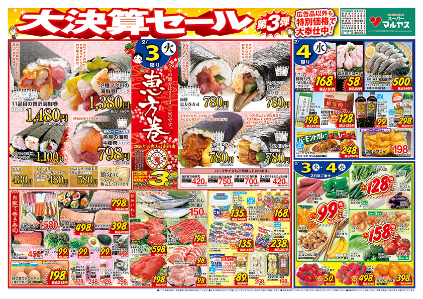 大決算セール!!第3弾 2月3日は節分 今年の恵方は南南東です!!マルヤスの手作り巻き寿司を食べて福を呼び込みましょう!